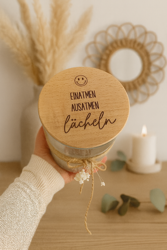 Vorratsglas- Einatmen Ausatmen Lächeln