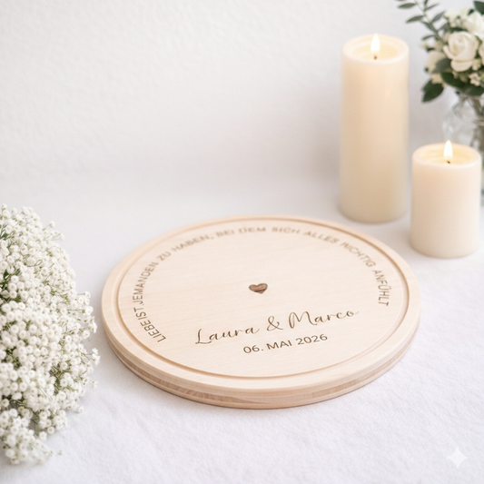 Personalisiertes Holzbrett rund zur Hochzeit-Gravur mit Namen & Datum "Liebe ist..."