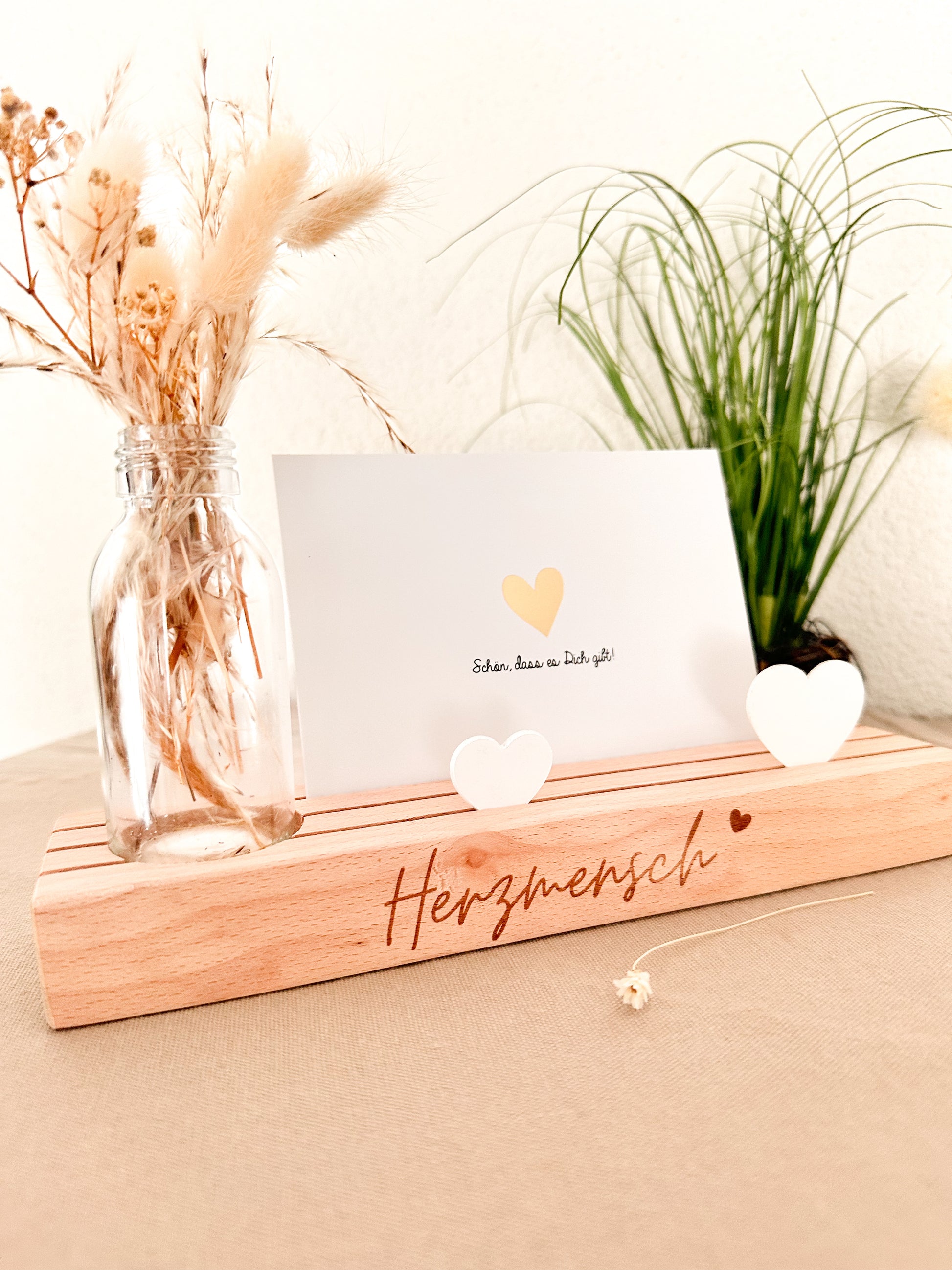 Du erhältst bei uns der Kartenständer mit der Gravur “Herzmensch“ mit einem kleinen Herz dahinter