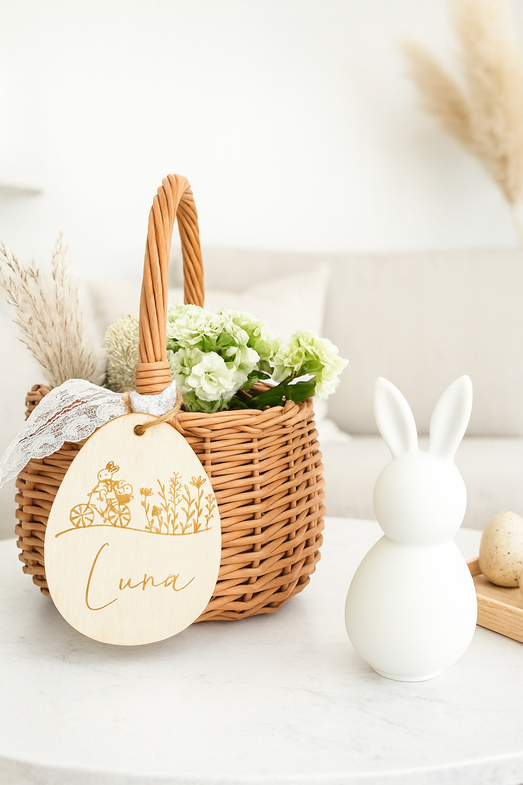 Der Korb kann wahlweise mit einem Holzanhänger oder bestellt , der mit einem individuellen Namen, einem Ostergruß oder einem festlichen Motiv graviert werden kann. Dieser Anhänger verleiht dem Korb eine persönliche Note und macht ihn zu einem ganz besonderen Geschenk.