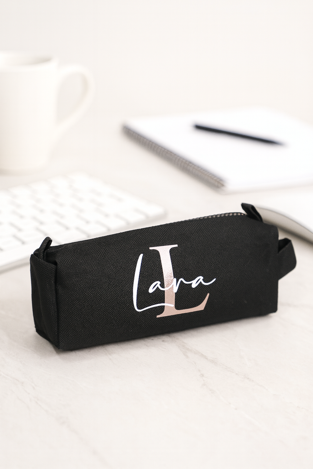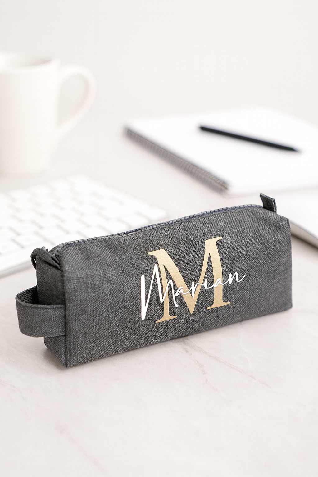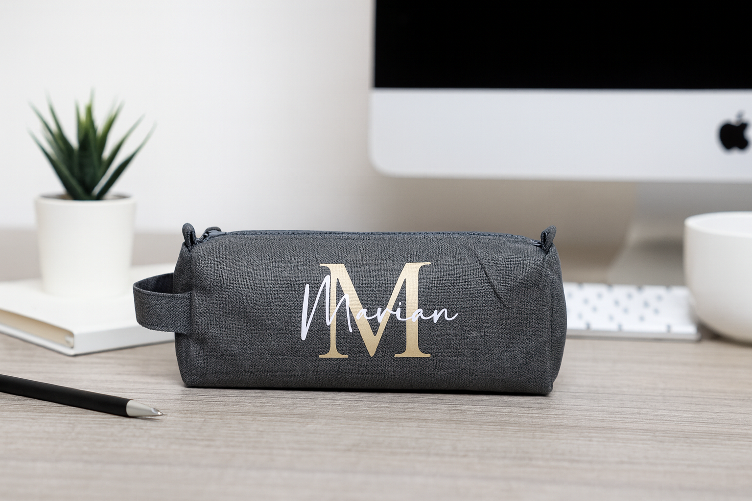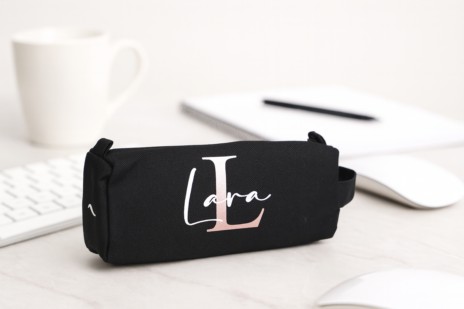 Du erhältst das Mäppchen in der Farbe Grau und Schwarz mit der gewünschte Name im Weiß. Das Initial kannst du in der Farbe :Roségold, Silber, Gold