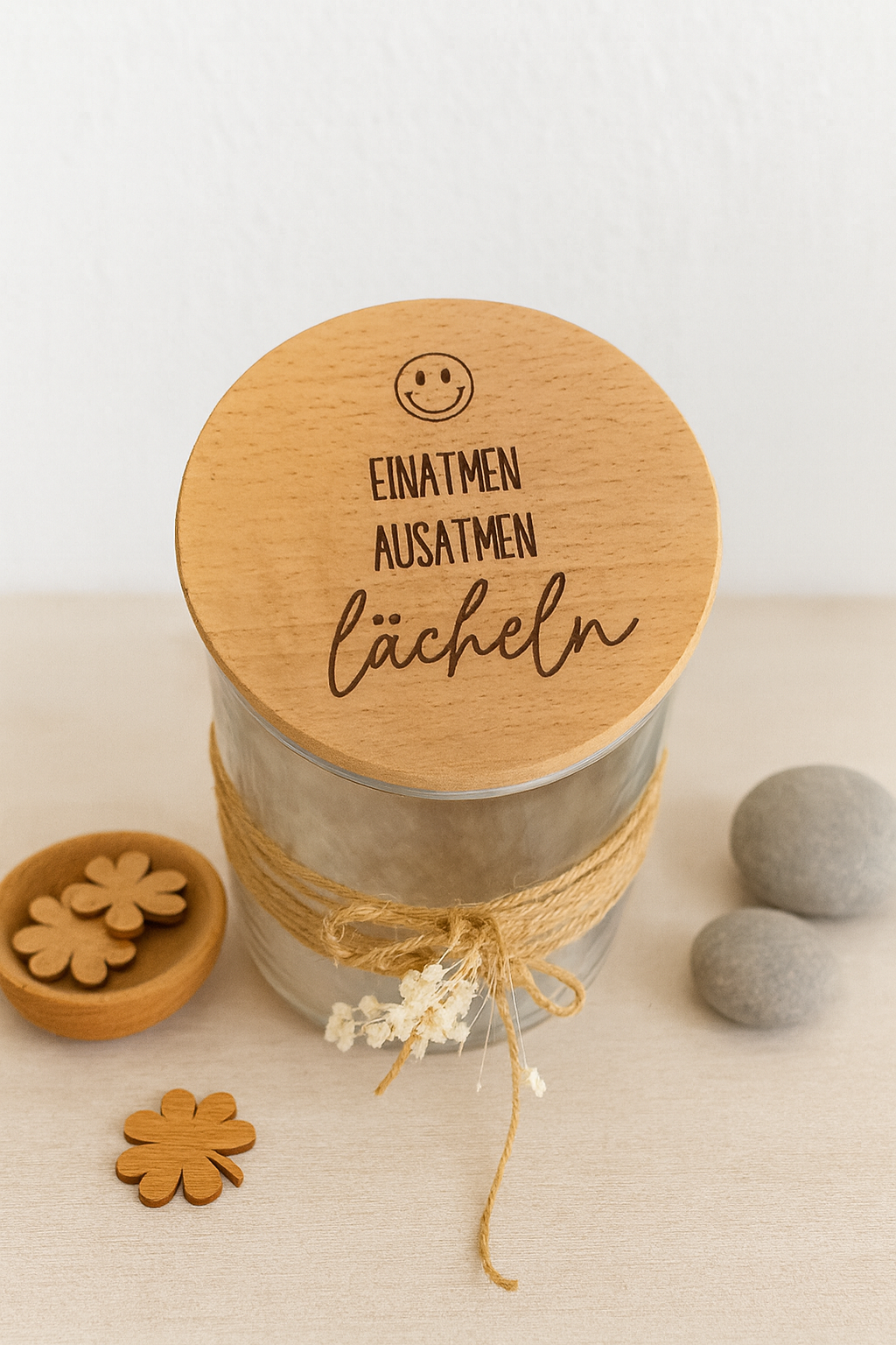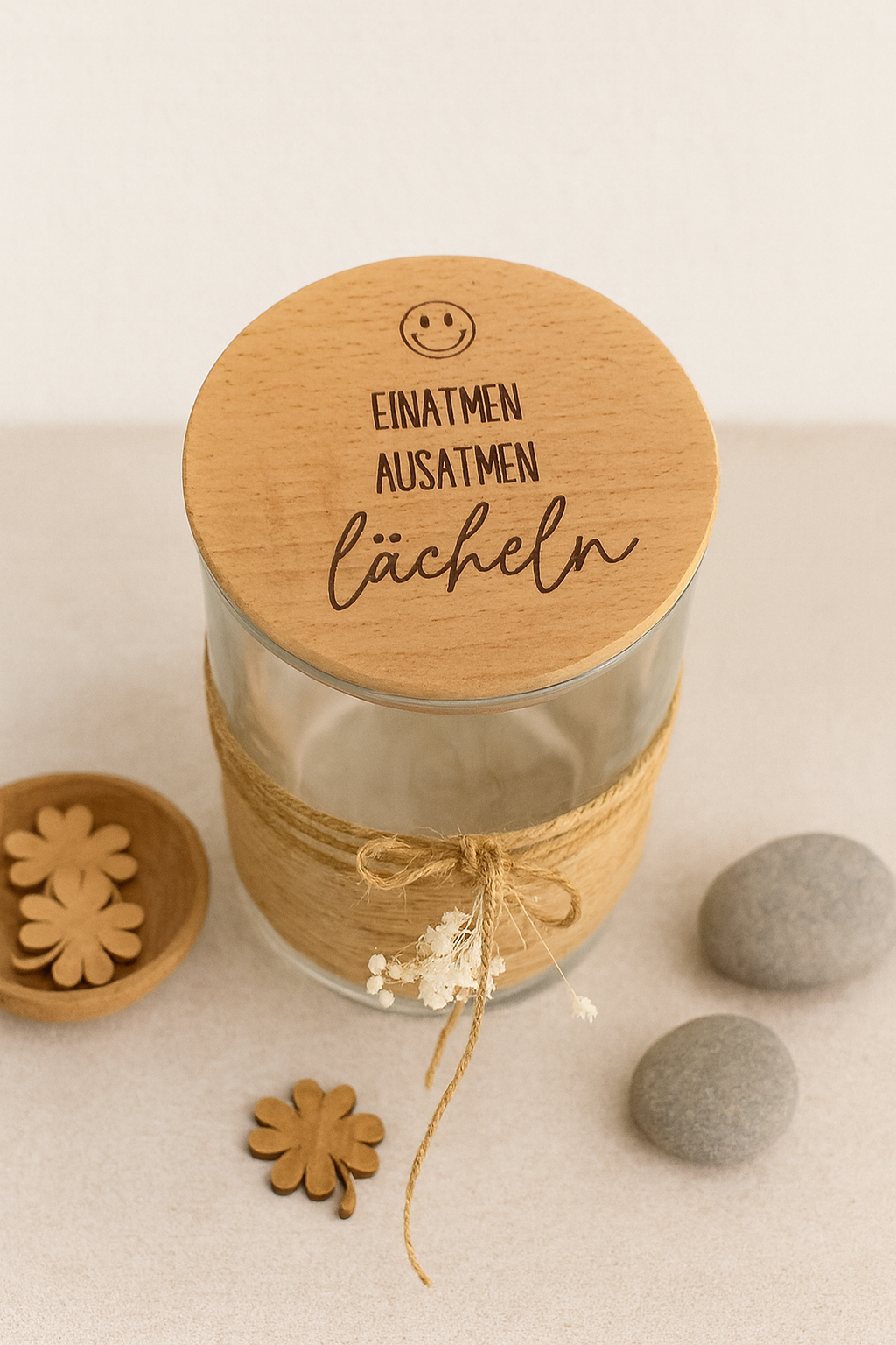 Suchst du nach dem perfekten Weg, um Ruhe und Achtsamkeit in dein Zuhause zu bringen oder einem lieben Menschen ein besonderes Geschenk zu machen? Unsere handgefertigte Vorratsgläser mit dem inspirierenden Spruch "Einatmen Ausatmen Lächeln" auf einem hochwertigen Holzdeckel ist genau das Richtige!