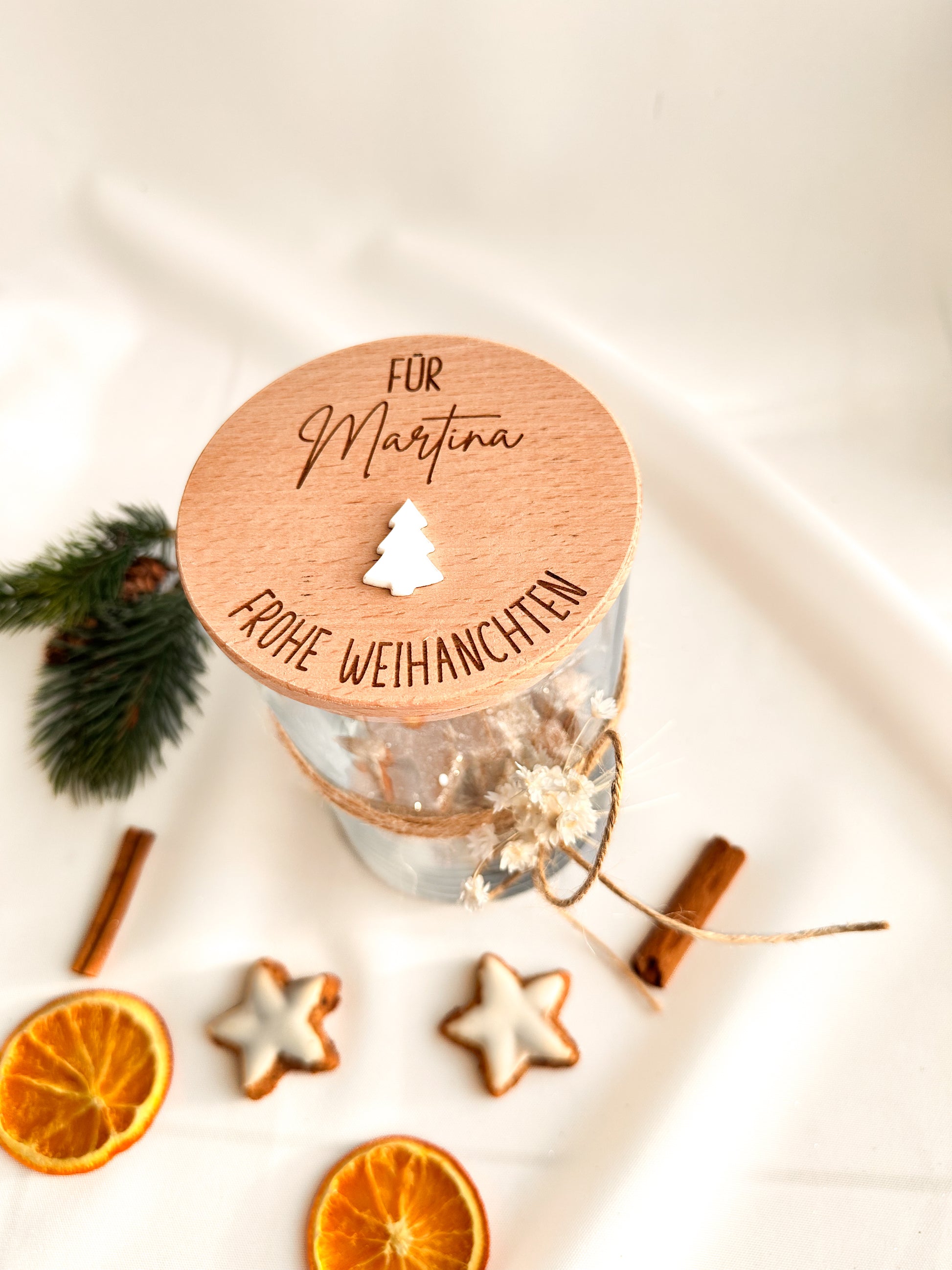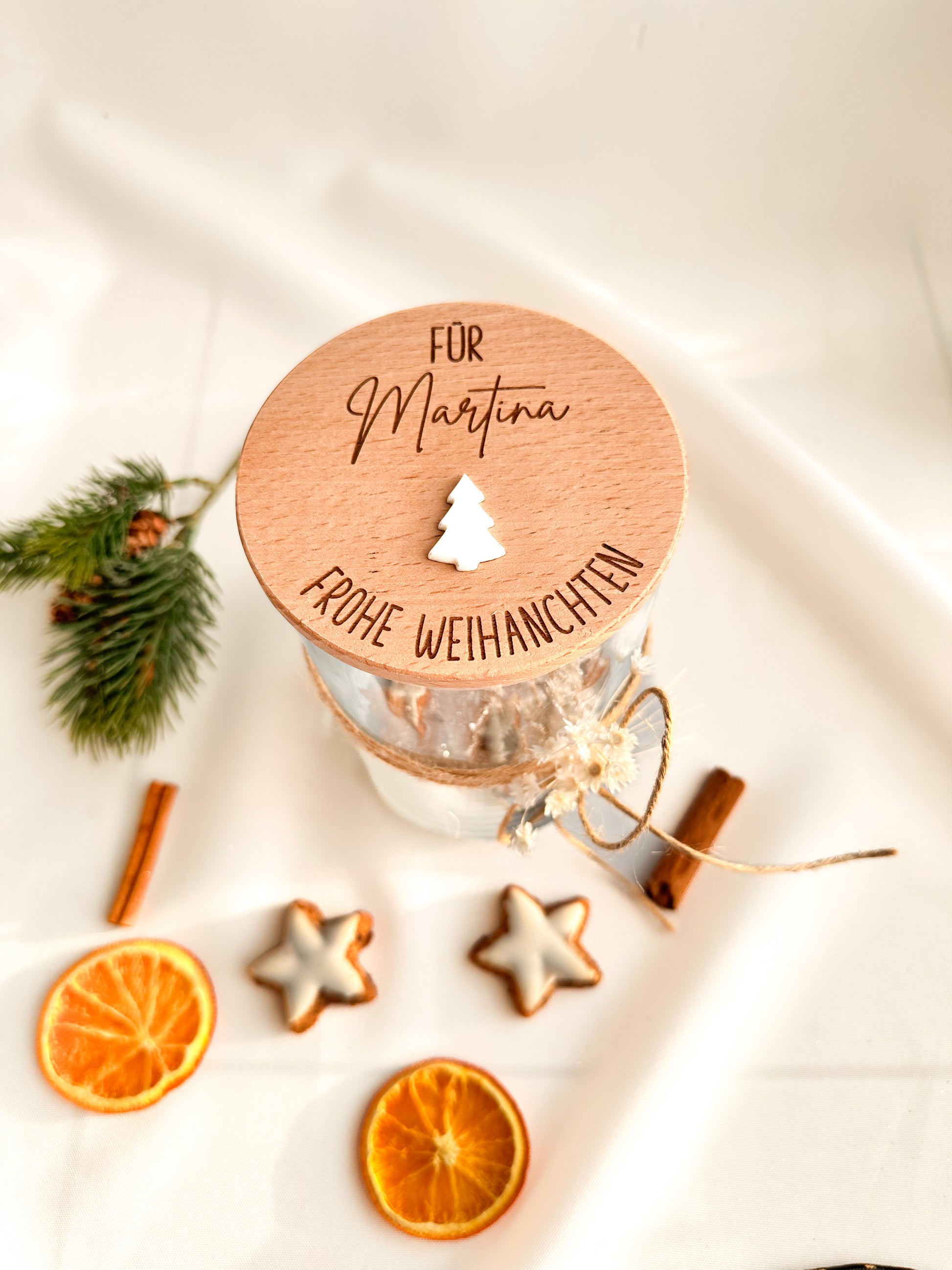Das Glas ist in zwei Größen erhältlich, 530 ml und 880 ml, und eignet sich ideal für die Aufbewahrung von vielen Leckereien egal ob zur Weihnachtszeit, es passt zur jeder Jahreszeit. Der gravierte Buchenholzdeckel schließt das Glas luftdicht ab und sorgt dafür, dass der Inhalt lange frisch bleibt. Mit der individuellen Gravur wird das Vorratsglas nicht nur zu einem praktischen Begleiter in der Küche, sondern auch zu einem dekorativen Highlight.